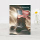 Um par de botas de combate robustas na areia do deserto, enrolado pela janela, com uma bandeira americana balançando dinamicamente sobre eles. Todo o texto pode ser mudado.