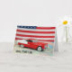 Antigo carro de Chevy, vermelho e branco, de 1955, num mapa de estradas com uma bandeira americana de fundo para o Dia de os pais. O texto é editável.