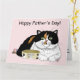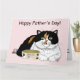 Um gato calico giro sentado ao lado da tigela de comida desejando um Dia de os pais feliz para o Pai Cat deles.