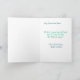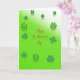 Trevos brilhantes sortudos colocados em um fundo gradiente verde e branco que diz "Feliz dia de São Patrício". O interior diz "desejando a você um pouco e muito boa sorte no dia de São Patrício. Todo o interior deste cartão é personalizável.