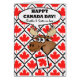 Uma alça engraçada atravessa uma parede de azulejos de folha de mapa no cobrir deste cartão de saudação do Dia do Canadá. Feliz Dia do Canadá! Irmão e cunhada, texto sobre o cobrir. Design contemporâneo de cor vermelha, branca, preta e acastanhada.