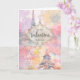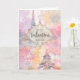 Cartão do Dia dos Namorados feminino e romântico em cores pastéis suaves com uma colagem com a Torre Eiffel, flores, folhas e outras marcas de aquarela.