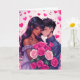 Casal anime bi-racial abraçando, cercado por notas musicais e corações roxos e rosados. Cartão do Dia dos Namorados personalizado para o casal que ama anime! Adicione sua foto e altere o texto na área de personalização.