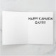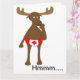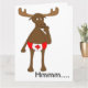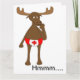 Uma imagem tirada mão de um alce que veste o roupa interior canadense da bandeira com a palavra "hmmm…" abaixo dele. Dentro do cartão diz "o DIA FELIZ de CANADÁ!!"