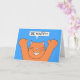 Um desenho da cabeça e ombros de um gato gigante. O gato tem suas patas dianteiras jogadas no ar e um sorriso grande mostrando seus dentes. O gato está dizendo "Seja feliz!" A imagem do gato é colocada sobre um fundo azul brilhante colorido.