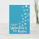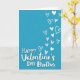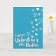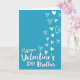 This Valentine's Day card features a bright blue background with faint diagonal stripes in a slightly darker blue. A trail of hearts rises from the middle-left up toward the top-right, mixing solid hearts and outline hearts. The hearts come in soft white, light pink, pale yellow, and light purple, and they feel like they’re floating upward with care. Along the lower part of the card, the message reads “HAPPY Valentine’s DAY Brother” in white letters. “Valentine’s” is larger and written in a smooth brush-style lettering, while “HAPPY” and “DAY Brother” use simpler, neat letter shapes. The mix of floating hearts and the direct message makes it feel sweet and supportive, especially for a brother you want to appreciate ❤️. It’s an easy way to show affection and keep things warm and sincere 🥰, perfect for sharing Valentine’s Day.