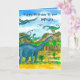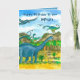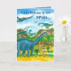 A fun custom name birthday card for kids featuring dinosaurs with a friendly Apatosaurus and two Gallimimus dinosaurs sparring in the background with prehistoric style birds flying in the sky drawn with ink and watercolor.