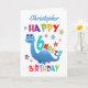 Um cartão especial de aniversário de 6 meses! Este brilhante cartão de aniversário de meio ano apresenta um dinossauro azul, algumas estrelas bonito e texto colorido. Um design bonito para alguém que terá meio ano de idade! Adicione o nome da criança de 6 meses à frente do cartão para personalizá-lo para o garoto ou garota especial. Em seguida, mude a dentro de mensagem para personalizá-la.