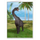 Renderização digital 3D de um dinossauro Brachiosaurus sobre fundo azul-céu e palmeiras verdes