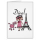 T-shirt da diva, bodysuits, canecas, bolsas, cartões, etiquetas, correntes chaves, travesseiros, pulsos de disparo de parede, e muito mais com um design bonito da diva que caracteriza uma menina de cabelo marrom em um chapéu e em um vestido cor-de-rosa com sua caniche cor-de-rosa perto da torre Eiffel!