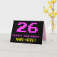 A frente deste design de cartão de saudação divertido, geek e com temas nerds de aniversário apresenta um grande número "26" e a mensagem "FELIZ ANIVERSÁRIO", cor-de-rosa, juntamente com um nome de destinatário personalizado amarelo ousado. O texto tem uma aparência inspirada no estilo clássico de 8 bits de gráficos de jogos de computador e vídeo dos anos 70 e 80, e o plano de fundo é preto. O dentro tem uma mensagem de saudação de aniversário personalizada, ou talvez possa ser apagado e deixado o vazio se uma mensagem for escrita à mão. Um bobo de aniversário personalizado como este pode ser uma maneira divertida de enviar uma mensagem celebrando o vigésimo sexto aniversário de alguém. [~Z0000478]