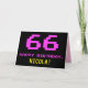 A frente deste design de cartão de saudação de aniversário divertido, geek e nerdy apresenta um grande número "66" e a mensagem "FELIZ ANIVERSÁRIO", cor-de-rosa, juntamente com um nome de destinatário personalizado amarelo ousado. O texto tem uma aparência inspirada no estilo antigo de gráficos de jogos para computador/vídeo de 8 bits dos anos 1970 e 1980, e o plano de fundo é preto. O dentro tem uma mensagem de saudação de aniversário personalizável, ou talvez possa ser apagado e deixado o vazio se uma mensagem for escrita à mão. Um bobo de aniversário personalizado como este pode ser uma maneira divertida de celebrar o sexagésimo sexto aniversário de alguém. [~Z0000478]