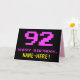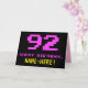 A frente deste design de cartão de saudação divertido, nerd e geek de aniversário apresenta um grande número cor-de-rosa "92", juntamente com a mensagem "FELIZ ANIVERSÁRIO", em rosa, e um nome de destinatário personalizado amarelo e arrojado. O texto apresenta um olhar inspirado no jogo clássico de 8 bits e nos gráficos de jogos de computador dos anos 70 e 80, e o plano de fundo é preto. O dentro tem uma mensagem de saudação de aniversário personalizada, ou talvez possa ser apagado e deixado o vazio se uma mensagem for escrita à mão. Um bobo de aniversário personalizado como este pode ser uma maneira divertida de enviar uma mensagem celebrando o 90° aniversário de alguém. [~Z0000478]