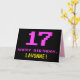 A frente deste design de cartão de saudação de temas divertidos, nerds e nerds de aniversário apresenta um grande número cor-de-rosa "17", juntamente com a mensagem "FELIZ BIRTHDAY", em rosa, e um nome de destinatário personalizável amarelo ousado. O texto apresenta uma aparência inspirada pela dos gráficos de jogos de vídeo/computador do estilo vintage de 8 bits das décadas de 1970 e 1980, e o fundo é preto colorido. O dentro apresenta uma mensagem de saudação de aniversário personalizada, ou talvez possa ser apagado e deixado o vazio se uma mensagem for escrita manualmente. Um cartão de aniversário personalizável como este pode ser uma maneira divertida de enviar uma mensagem para celebrar o 17º aniversário de alguém. [~Z0000478]