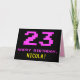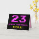 A frente deste design de cartão de saudação de aniversário divertido, geek e nerdy apresenta um grande número cor-de-rosa "23", juntamente com a mensagem "HAPPY BIRTHDAY", em rosa, e um nome de destinatário personalizado amarelo ousado. O texto tem uma aparência inspirada no estilo retro de 8 bits de vídeo game e gráficos de computador das décadas de 1970 e 1980, e o fundo é preto colorido. O dentro apresenta uma mensagem de saudação de aniversário personalizada, ou talvez possa ser apagado e deixado o vazio se uma mensagem for escrita manualmente. Um cartão de aniversário personalizável como este pode ser uma maneira divertida de reconhecer o vigésimo terceiro aniversário de alguém. [~Z0000478]