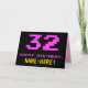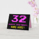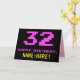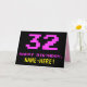 A frente deste design de cartão de saudação de aniversário divertido, geek e nerdy apresenta um grande número "32" e a mensagem "FELIZ BIRTHDAY", cor-de-rosa, juntamente com um nome de destinatário personalizado amarelo arrojado. O texto apresenta uma aparência inspirada no estilo retro de gráficos de jogos de vídeo/computador de 8 bits dos anos 70 e 80, e o plano de fundo é preto colorido. O dentro apresenta uma mensagem de saudação de aniversário personalizada, ou talvez possa ser apagado e deixado o vazio se uma mensagem for escrita manualmente. Um cartão de aniversário personalizado de bobo como este pode ser uma maneira divertida de reconhecer o trinta e dois anos de alguém. [~Z0000478]