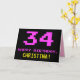 A frente deste design de cartão de saudação de diversão, geek e nerdy, com tema de aniversário, apresenta um grande número "34" e a mensagem "HAPPY BIRTHDAY", cor-de-rosa, juntamente com um nome de destinatário personalizado amarelo arrojado. O texto tem uma aparência inspirada na dos gráficos clássicos de jogos de vídeo/computador do estilo 8-bits dos anos 70 e 80, e o fundo é preto colorido. O dentro apresenta uma mensagem de saudação de aniversário personalizada, ou talvez possa ser apagado e deixado vazio se uma mensagem for escrita manualmente. Um cartão de aniversário personalizado de bobo como este pode ser uma maneira divertida de enviar uma mensagem celebrando o trinta e quatro anos de alguém. [~Z0000478]