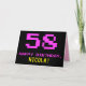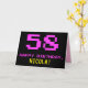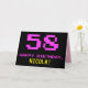 A frente deste design de cartão de saudação de temas divertidos, nerds e nerds de aniversário apresenta um grande número cor-de-rosa "58", juntamente com a mensagem "HAPPY BIRTHDAY", em rosa, e um nome de destinatário personalizado amarelo ousado. O texto apresenta um aspecto inspirado pelo dos gráficos clássicos de jogos de vídeo/computador do estilo 8-bits dos anos 70 e 80, e o fundo é preto colorido. O dentro apresenta uma mensagem de saudação de aniversário personalizada, ou talvez possa ser apagado e deixado o vazio se uma mensagem for escrita manualmente. Um cartão de aniversário personalizado de bobo como este pode ser uma maneira divertida de enviar uma mensagem celebrando o cinquenta e oitavo aniversário de alguém. [~Z0000478]