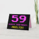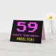 A frente deste design de cartão de saudação de temas divertidos, geek e nerdy aniversariante apresenta um grande número cor-de-rosa "59", juntamente com a mensagem "HAPPY BIRTHDAY", em rosa, e um nome de destinatário personalizado amarelo ousado. O texto apresenta uma aparência inspirada pela dos gráficos de jogos e jogos de computador retrorados do estilo 8-bit dos anos 70 e 80, e o plano de fundo é preto. O dentro apresenta uma mensagem de saudação de aniversário personalizável, ou talvez possa ser apagado e deixado o vazio se uma mensagem for escrita manualmente. Um cartão de aniversário personalizado de bobo como este pode ser uma maneira divertida de celebrar o cinquenta e nono aniversário de alguém. [~Z0000478]