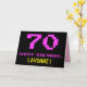 A frente deste design de cartão de saudação divertido, nerd e geeky aniversariante apresenta um grande número cor-de-rosa "70", juntamente com a mensagem "HAPPY BIRTHDAY", em rosa, e um nome de destinatário personalizável amarelo arrojado. O texto apresenta uma aparência inspirada no estilo retro de gráficos de jogos de vídeo/computador de 8 bits dos anos 70 e 80, e o plano de fundo é preto colorido. O dentro tem uma mensagem de saudação de aniversário personalizada, ou talvez pudesse ser apagado e deixado vazio se uma mensagem for escrita manualmente. Um cartão de aniversário personalizado de bobo como este pode ser uma maneira divertida de enviar uma mensagem celebrando o 70º aniversário de alguém. [~Z0000478]