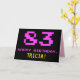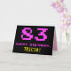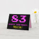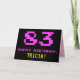 A frente deste design de cartão de saudação de aniversário divertido, nerd e geek apresenta um grande número "83" e a mensagem "HAPPY BIRTHDAY", cor-de-rosa, juntamente com um nome de destinatário personalizável amarelo arrojado. O texto tem uma aparência inspirada no estilo de videogame antigo de 8 bits e gráficos de jogos de computador das décadas de 1970 e 1980, e o fundo é preto colorido. O dentro apresenta uma mensagem de saudação de aniversário personalizada, ou talvez possa ser apagado e deixado vazio se uma mensagem for escrita manualmente. Um cartão de aniversário personalizado de bobo como este pode ser uma maneira divertida de reconhecer o oitenta e terceiro aniversário de alguém. [~Z0000478]