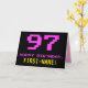 A frente deste design de cartão de saudação de temas divertidos, nerds e nerds de aniversário apresenta um grande número cor-de-rosa "97", juntamente com a mensagem "HAPPY BIRTHDAY", em rosa, e um nome de destinatário editável amarelo arrojado. O texto apresenta uma aparência inspirada pela dos gráficos clássicos de jogos de computador e de jogos de vídeo do estilo 8-bits dos anos 70 e 80, e o fundo é preto colorido. O dentro tem uma mensagem de saudação de aniversário editável, ou talvez possa ser apagado e deixado vazio se uma mensagem for escrita manualmente. Um cartão de aniversário personalizado de bobo como este pode ser uma maneira divertida de reconhecer o nonagésimo sétimo aniversário de alguém. [~Z0000478]
