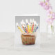 Cartão do cupcake, com uma fotografia de um cupcake e de lotes de velas iluminadas do aniversário, nela. Personalize o texto para dentro com seus próprios cumprimento e nome. Grande cartão da empresa para empregados e clientes.