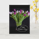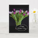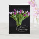 Este cartão do Dia das Mães é exibido com uma linda impressão de foto de tulipas roxas.