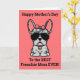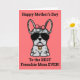Frenchies, mostre amor para a Mamãe neste Dia das Mães com um cartão personalizado só seu. A mensagem na frente do cartão diz “Feliz Dia das Mães para a Melhor Mãe Frenchie de Todas!" A mensagem interna diz “Eu te amo mais do que passeios, Feliz Dia das Mães.” O design apresenta uma ilustração estilo desenho animado fofo de uma fêmea de bulldog francês cor merle azul usando um laço e coleira rosa. A fonte e a cor do fundo podem ser alteradas selecionando “Clique para personalizar ainda mais.”
