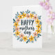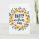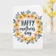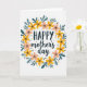 Este cartão do Dia das Mães apresenta uma grinalda circular de flores e folhas estilizadas em um fundo branco, envolvendo a mensagem em um abraço suave e afetuoso ❤️. A palavra “FELIZ” está no topo em um estilo de letra escuro e grosso, enquanto “dia das mães” aparece logo abaixo em uma letra fluida e cursiva para um contraste mais suave e terno. A grinalda mistura flores amarelas ensolaradas com flores cor-de-rosa, sugerindo o tipo de proximidade calorosa que você compartilharia em um longo abraço ou um olhar doce e compreensivo 🌼. Folhas alongadas em azul-celeste se entrelaçam entre as flores, dando ao anel um ritmo calmo e constante que parece uma companhia solidária. Pequenos pontos pretos estão espalhados ao redor da disposição como confetes, adicionando uma energia leve e amigável sem lotar o centro. Pequenas marcas douradas em forma de explosão de estrelas brilham entre as pétalas e folhas, sugerindo pequenos momentos de cuidado compartilhados ao longo do dia. As flores formam um círculo uniforme ao redor do texto central