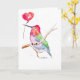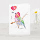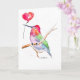 Pintura original em aquarela e tinta de um beija-flor apaixonado por um balão na ponta do bico. Envie este cartão único para o seu amor no Dia dos Namorados.