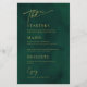 Cartão Real Emerald Green Dourado do Menu de Casamento Islâmico. Este cartão de cardápio de casamento é um verdadeiro chuveiro! A frente tem um belo fundo verde esmeralda com elegante caligrafia dourada. Começa com 'Bismillah' e a frase árabe 'wa khalaqnakum azwaja' (que significa 'E nós criamos você em pares'), seguida dos nomes dos casais, da data do casamento e do local. O verso também é esmeralda verde, e ele exibe elegantemente 'O Menu' no topo. O cardápio em si é belamente apresentado na caligrafia dourada, listando todas as deliciosas iniciações, cursos principais e sobremesas. É um toque muito especial para sua celebração de casamento.