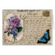 Uma antiguidade, cartão francês escrito mão faz um contexto maravilhoso para o buquê das flores e da borboleta azul no canto.
