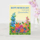 Um cartão do Dia das Mães muito bonito para a sua avó, com um canteiro de flores colorido, feito a partir de uma colagem de papel pintado à mão. As flores são altas e pequenas, vermelhas, rosas, laranjas e tons de azul, com uma cerca branca atrás delas, contra um fundo amarelo ensolarado. A saudação na capa frontal, em letras azul-escuras, é 'FELIZ DIA DAS MÃES para uma avó muito especial!'. A mensagem interna é apenas uma sugestão e você pode facilmente alterá-la ou excluí-la se desejar.