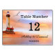 A mesa Wedding numera o cartão com uma pintura de um farol no oceano no por do sol em cores mornas. Você pode personalizar ou suprimir dos textos. Para todas as opções, escolha "personalizam-na". Este cartão do número da mesa é perfeito para uma praia ou um casamento do destino. Arte original pelo Vis do ©Anne.