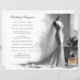 Esta elegante carta do programa de casamento apresenta um delicado esboço a lápis de um vestido de noiva em um manequim, um buquê vintage que repousa sobre uma pequena mesa, e uma garrafa perfume clássica inspirada pela Chanel — o único elemento em tons cor-de-rosa suave. Um design eterno perfeito para um casamento romântico, preto e branco com uma reviravolta antiga. Ideal para casamentos formais, cerimônias de jardim elegantes e saraus íntimos. Personalize com os detalhes da sua cerimônia, as leituras e a ordem dos eventos. Uma maneira graciosa de guiar seus convidados através do seu dia especial. Conjunto correspondente disponível: convites, cartão RSVP, Salvar Data, envelope e sinalização.