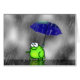 Sapo verde pequeno bonito para fora em um dia chuvoso sob um guarda-chuva azul. Divertimento e cartão original para alguma ocasião! Arte original dos desenhos animados por Taylor Addams. Vazio para dentro. Personalize com seu próprio texto.