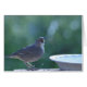 Travado em pleno acto de lançar algumas gotas da água em sua audiência, olhares deste pássaro do thrasher para fora em você em um relance startled, bico aberto ainda pasmado, seu prato da água branca apenas na frente dele. Contra um fundo verde borrado, este pássaro cinza-suportado com um bocado do branco em sua garganta está estando em uma parede da rocha no quintal da minha irmã perto de Tucson, AZ. Copyright Gail Storrs 2007.