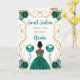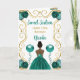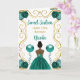 Este doce convite de 16 anos apresenta uma elegante estrutura dourada, uma bela princesa com pele escura e um vestido azul teal, flores e um balão.