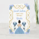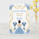 Este doce convite de 16 anos apresenta uma elegante estrutura de ouro, uma bela princesa de cabelo castanho e um vestido azul empoeirado, flores e um balão.
