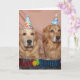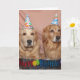 These golden retrievers are wearing party hats with a sign and want to wish you a doggone happy birthday!