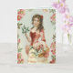 Esta jovem está coletando e enchendo seu chapéu com flores de Lírio-do-Valle. O fundo é azul claro e uma moldura de Rosas Silvestres cor-de-rosa emoldura a cena vitoriana.