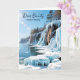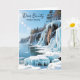 A keeping in touch card with an illustration of Door County, Wisconsin in the winter The pretty dune ledges covered in icicles and frozen blue ice, blue water of Lake Michigan hitting against the bluffs, Sun shining lighting up the sparkling snow and ice.