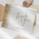 Este elegante e moderno cartões de agradecimentos de casamento mostra uma borda de ouro falso brilhando em um fundo branco. O texto personalizável combina as palavras "Obrigado" em um guião de manuscrito dourado e os nomes da noiva e do noivo em itálico.
