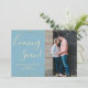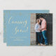 Confetti Dourado em Cartões de Anúncio de Gravação de Foto Personalizada Azul Claro. Esperando pais! A moderna mão escreveu carta de tipografia "chegando em breve" para compartilhar suas boas notícias com amigos e familiares. Recursos acima e o quadro de configuração ouro inferior em fundo azul claro. Você pode personalizar a design substituindo os textos simples e a foto vertical. Se precisar de ajuda ou de itens correspondentes, entre em contato comigo! 3351