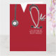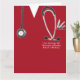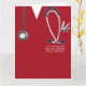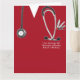 Cartão de licenciatura em Medicina Criativa, com esfregões de hospital vermelhos, estetoscópio e ilustração engraçada com faca do exército suíço. Edite texto para personalizar para seu formando médico favorito.