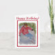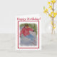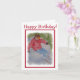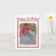 Happy Birthday Card featuring a downhill skier wearing a red jacket, blue jeans and gold goggles - racing the slopes of powder - an awesome card for any winter sport lover .. Skier has been painted in watercolors by the designer