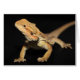 Um curioso dragão barbudo olhando para frente em frente a um fundo preto.