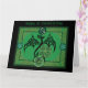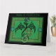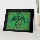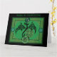 Dragão preto tribal com asas de nó celta. Sombras se o nó verde e celta funcionar todo atrás e ao redor do dragão e quatro trevos de folha.