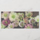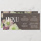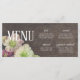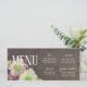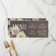 Cartão de menu com primavera vivo florescendo em tons movidos e mudados contra um pano de fundo de madeira de noz escura. Um simples texto branco permite que o seu convidado saiba o que está em jogo. Este design faz parte da nossa Coleção Hellebore Harvest da Caixa de Joias. Visite nossa loja para mais designs.
